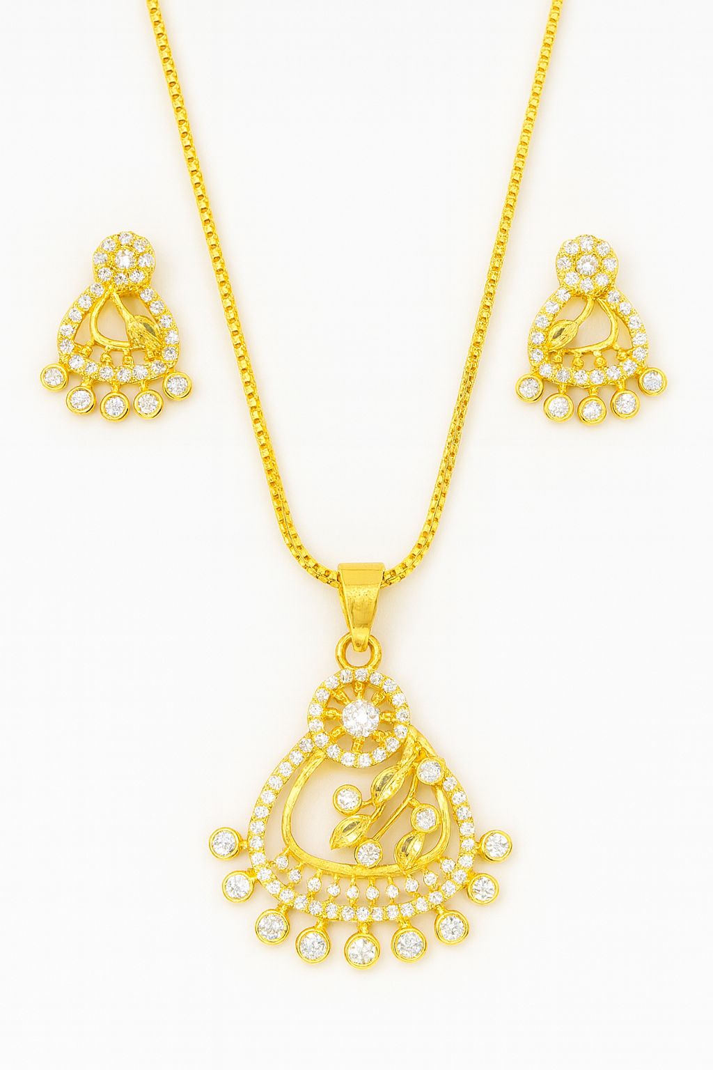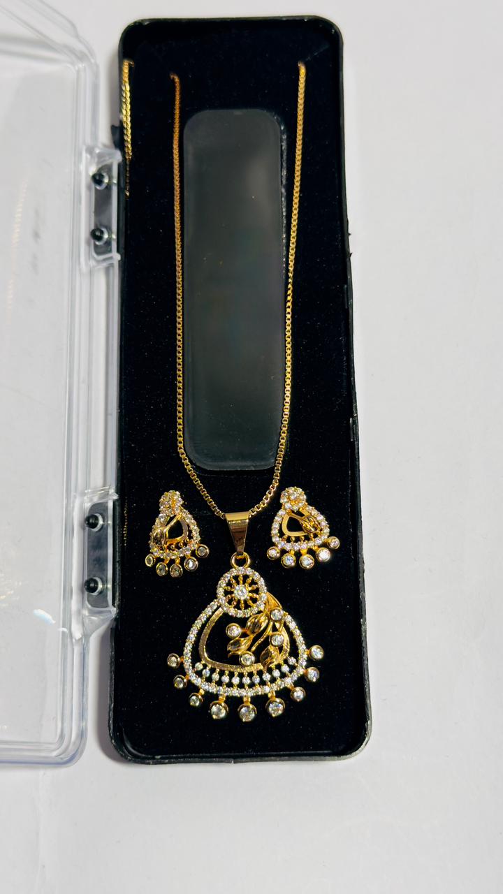 This stunning American diamond necklace set features a beautifully crafted rose gold plated pendant with a unique concentric circle design, highlighted by sparkling CZ stones for a luxurious shine. The intricate lattice detailing at the base adds a touch of elegance and sophistication. Paired with matching rose-gold plated earrings, this set offers a perfect blend of modern style and traditional charm. Its lightweight design makes it comfortable for all-day wear, ideal for festive celebrations, parties, and special occasions. A beautiful accessory for women who love timeless beauty and refined craftsmanship in their jewellery collection.
