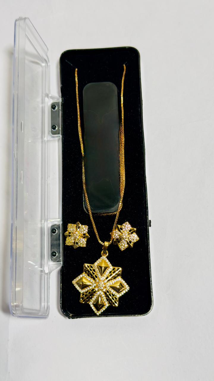 This stunning American diamond necklace set features a beautifully crafted rose gold plated pendant with a unique concentric circle design, highlighted by sparkling CZ stones for a luxurious shine. The intricate lattice detailing at the base adds a touch of elegance and sophistication. Paired with matching rose-gold plated earrings, this set offers a perfect blend of modern style and traditional charm. Its lightweight design makes it comfortable for all-day wear, ideal for festive celebrations, parties, and special occasions. A beautiful accessory for women who love timeless beauty and refined craftsmanship in their jewellery collection.