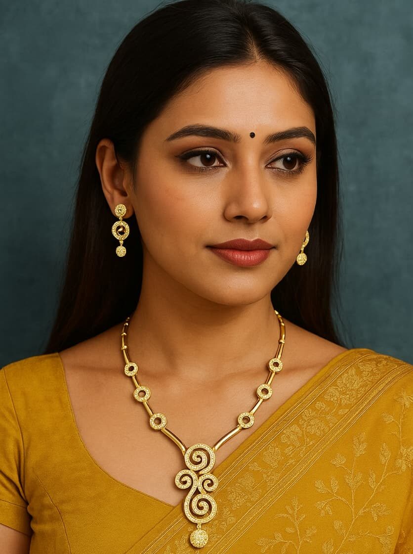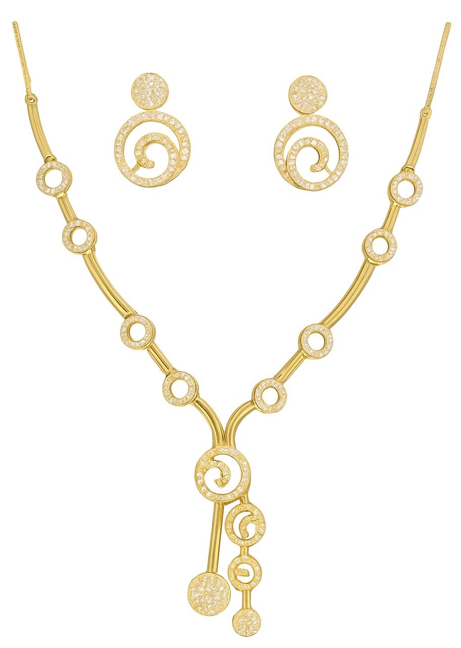 This elegant American diamond necklace set features a modern spiral design crafted with precision and style. The gold-plated chain is adorned with sparkling circular motifs, each shimmering with high-quality CZ stones for a brilliant, diamond-like shine. The centerpiece showcases cascading spiral drops, creating a luxurious statement look perfect for parties, weddings, and festive occasions. Complementing earrings complete the set with matching spiral and circular detailing. Lightweight, durable, and dazzling, this necklace set adds sophistication to any outfit, making it an ideal choice for modern women who love timeless glamour and refined elegance